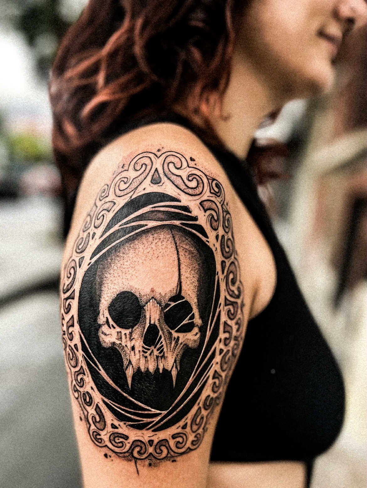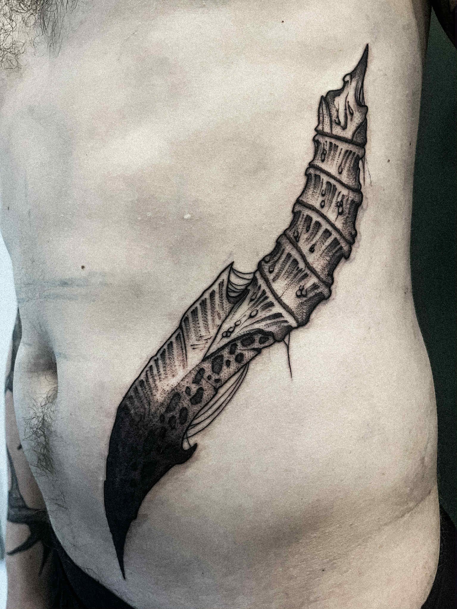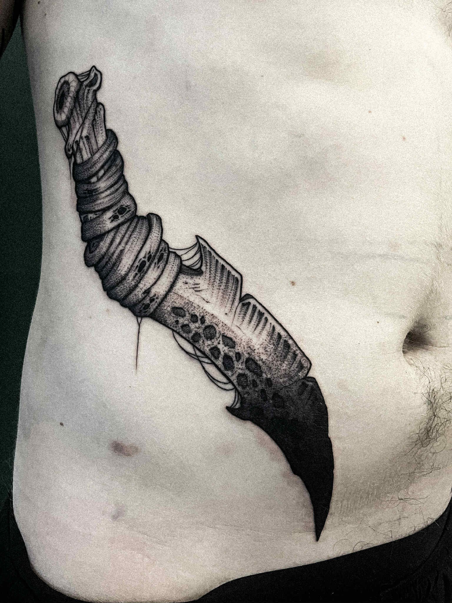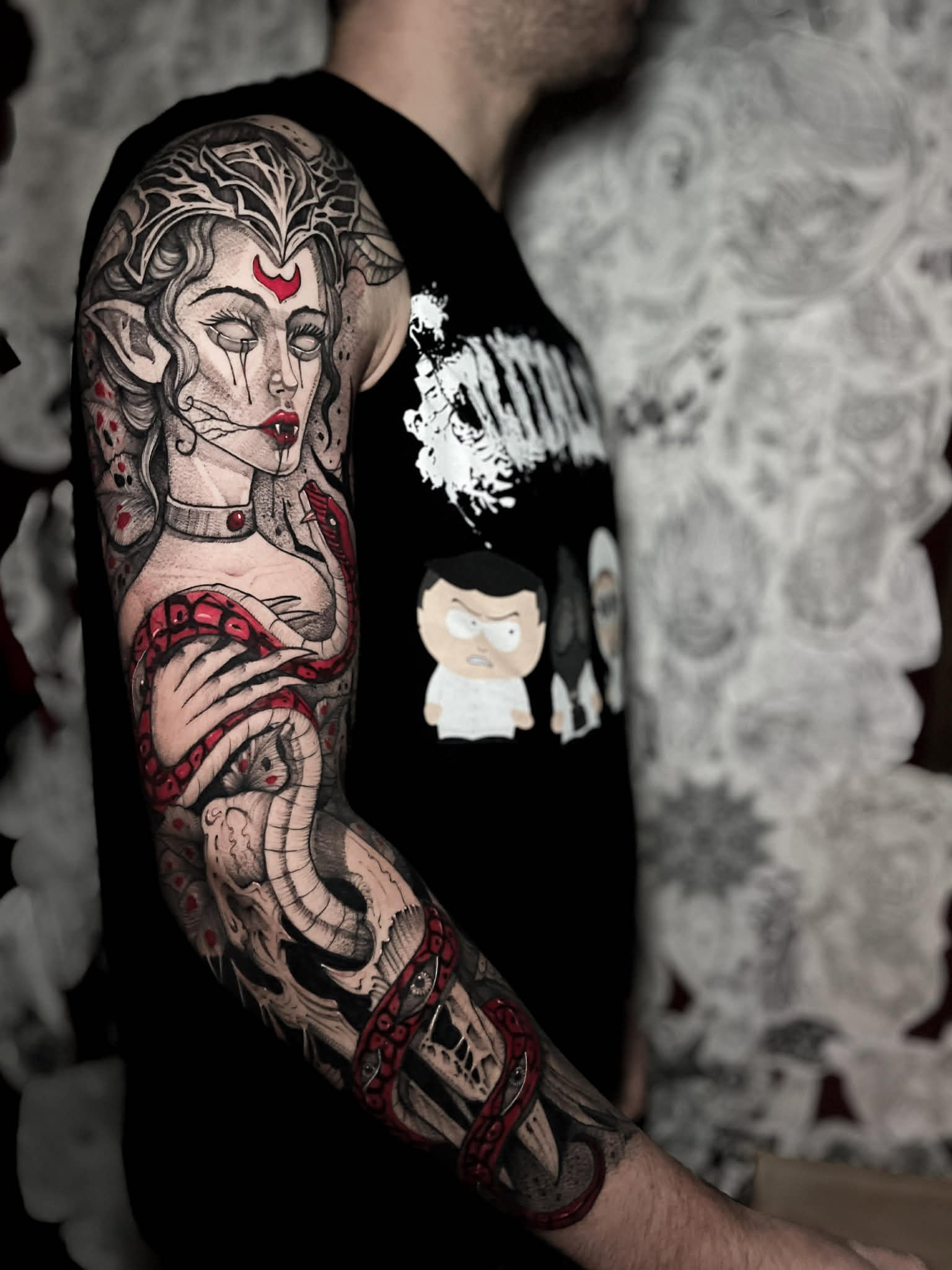 Mon style blackwork, avec ses contrastes forts et ses détails précis, est parfait pour donner vie à ces thèmes : runes, créatures étranges, artefacts anciens…