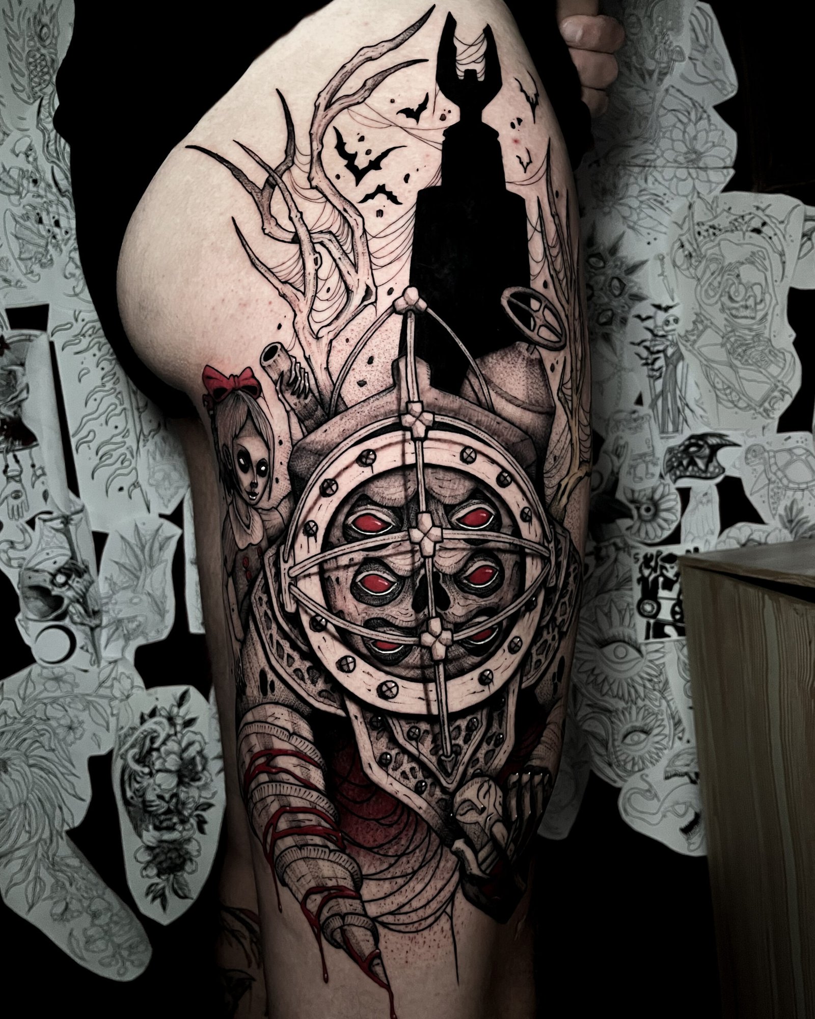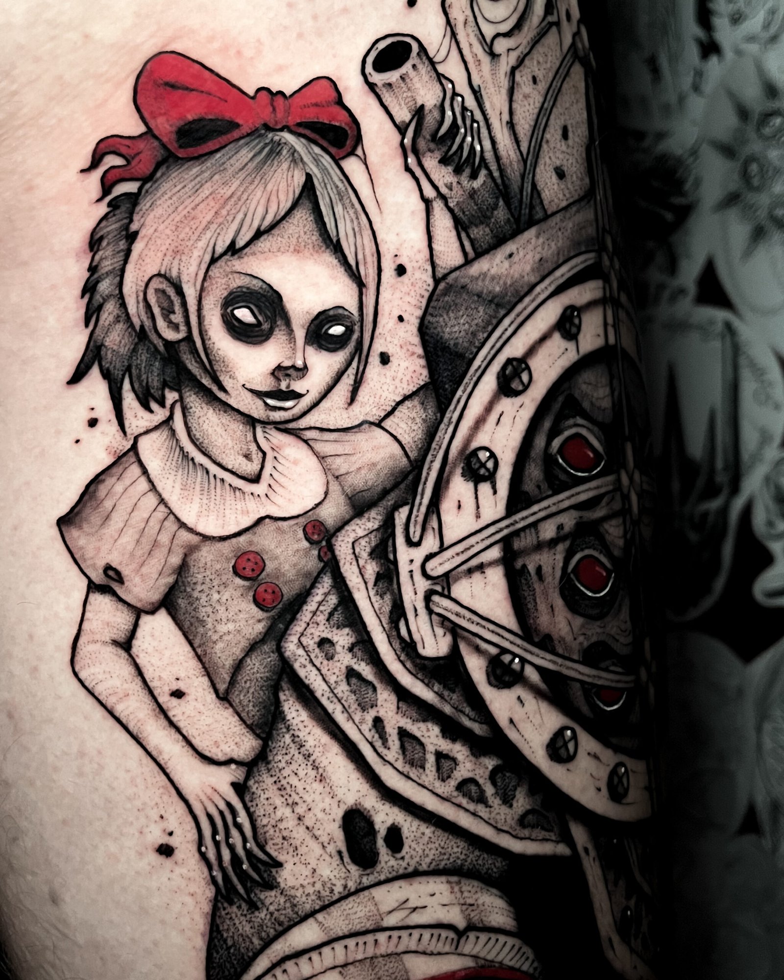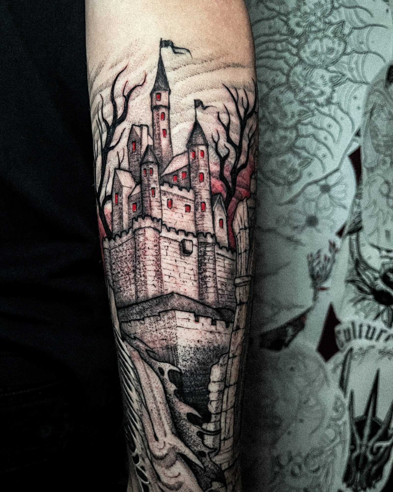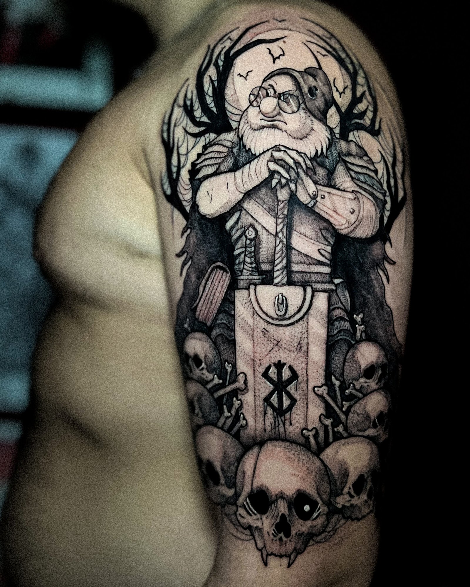 Mon style blackwork me permet de traduire l’intensité de ces univers : silhouettes marquées, contrastes forts, détails qui rappellent un personnage ou une scène culte sans tomber dans la simple copie.
